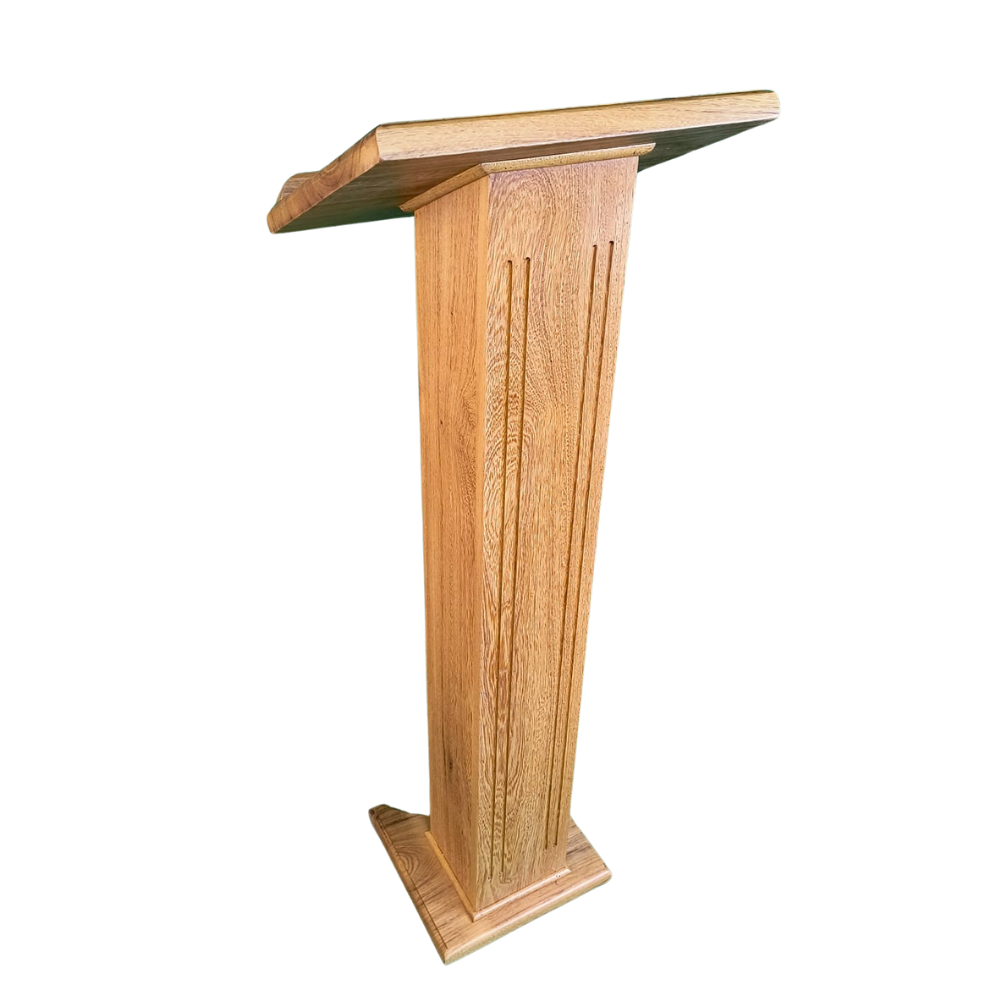 A madeira selecionada e o acamabento em verniz especial, garantem acabamento premium para as peças de mobiliario liturgico.