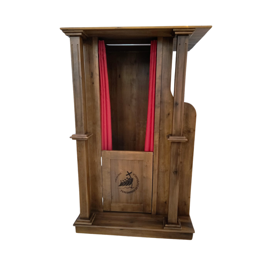 Produzido inteiramente em madeira maciça nobre. A porta possui gravação laser personalizada conforme a necessidade de cada paróquia, havendo a possibilidade de ser adicionados apliques em metal (consultar orçamento). Ascento confortável para o sacerdote, com apoio de braços e cortina. O espaço de confissão dos fies conta com genuflexório estofado e também apoio de braços.