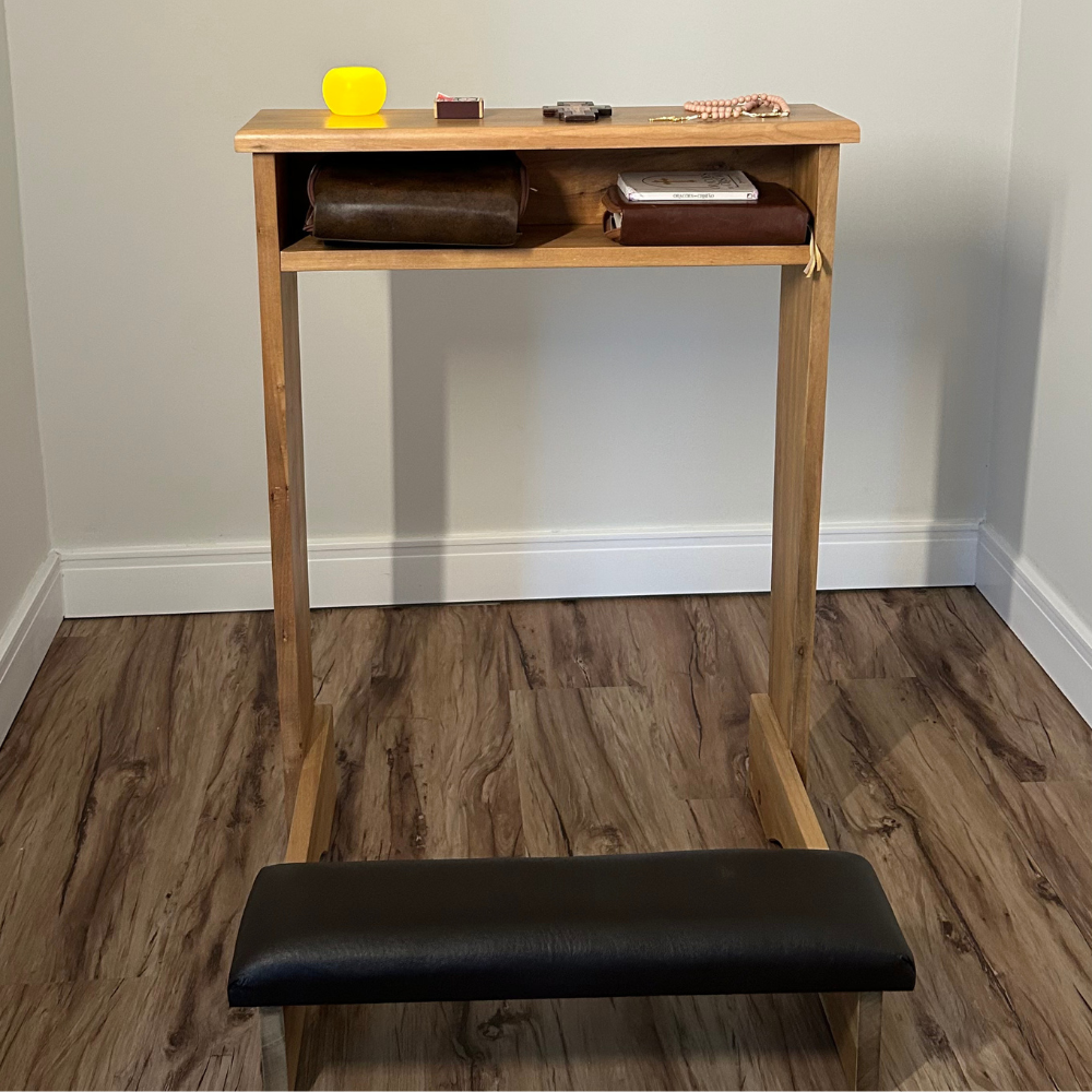 A prática da oração e da devoção pessoal fortalecem, descansam e renovam o espírito para o testemunho e as lutas de cada dia. O genuflexório Santo Agostinho oferece a condição necessários para a piedade dos fiéis em um designe exclusivo Sacro Legno. A madeira em suas características naturais confere ainda mais nobreza e elegância para a peça. O porta livros abaixo do apoio de cotovelos auxilia na organização dos materiais utilizados na oração, como terço, bíblia e outros.