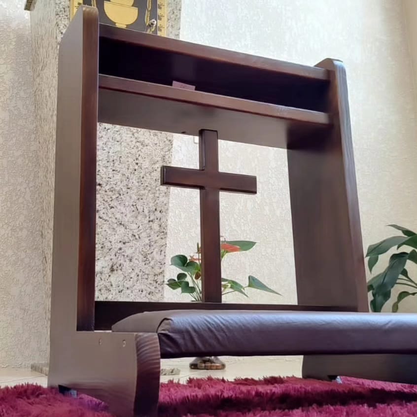 O genuflexório São Francisco oferece a provocação e ascese necessários para a piedade dos fiéis em um designe exclusivo Sacro Legno. Produzido em madeira maciça selecionada e tonalizada. Estofado em couro tipo courvin disponível nas cores preto, bege, vermelho e marrom. Suave inclinação para apoio de braços. Organizador porta bíblia e materiais de oração. Disponível para 1 ou 2 pessoas.
