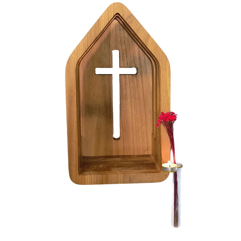 A capelinha Anunciação é uma proposta contemporânea para formação de espaços de oração em ambientes residenciais e comerciais. A proposta de sua construção une o formato tradicional de capelinhas que apontam para o céu com a beleza da madeira maciça nobre aproveotando o máximo da iluminação natural que perpassa as brechas laterais. É produzida com madeira nobre de Tauari e acabamento natural com cera de abelha, afim de preservar as características naturais e originais da madeira. A base metálica em cor ouro que acompanha a capelinha suporta uma pequena vela e um tubo de vidro incolor, que permite colocar água para flores vivas. No espaço interno é possível colocar imagens de santos.