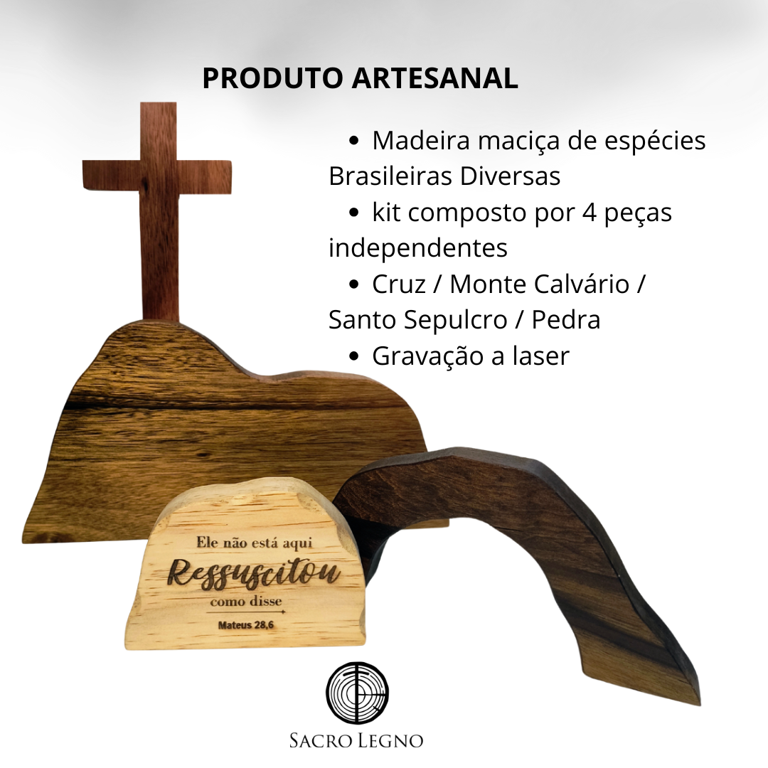 Santo Sepulcro é um “cenário” composto por diferentes espécies de madeiras, que juntas oferecem a variação de tonalidades natural do kit. O produto contém 4 peças que formam os 2 principais cenários responsáveis por trazer sentido a fé cristã: O monte Gólgota (calvário) onde Jesus foi crucificado e o Sepulcro no jardim de José de Arimatéia onde Jesus Ressuscitou. A pedra do sepulcro traz a gravação feita a laser com a frase “Não está aqui, ressuscitou”. A cruz é fixada na parte de trás do calvário e é retrátil, podendo ser recolhida para facilitar o processo de guardar e/ou embalar para presentear. Acabamento das peças com óleo mineral sem cheiro.